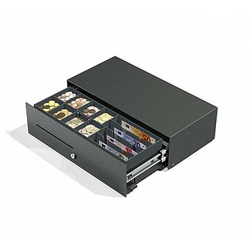 Mit einer Tiefe von gerade einmal 225 mm und einem robusten Stahlgehäuse ist die Kassenschublade Micro des Hersteller AGP (vormals CashBase) für den Einsatz an schmalen Verkaufstresen prädestiniert.
